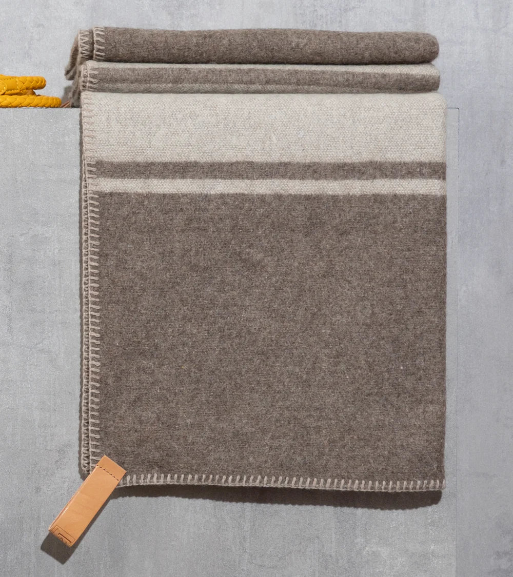 Ein praktischer Griff aus echtem Leder ermöglicht das einfache Aufhängen oder Verstauen der Decke. Der bestickte Rand mit kontrastierenden Sattelstich-Details verleiht ihr eine besonders elegante und handwerkliche Optik.